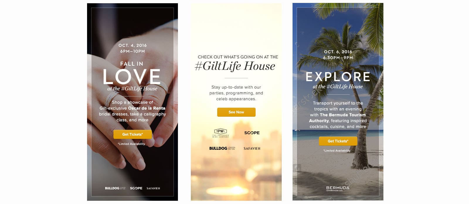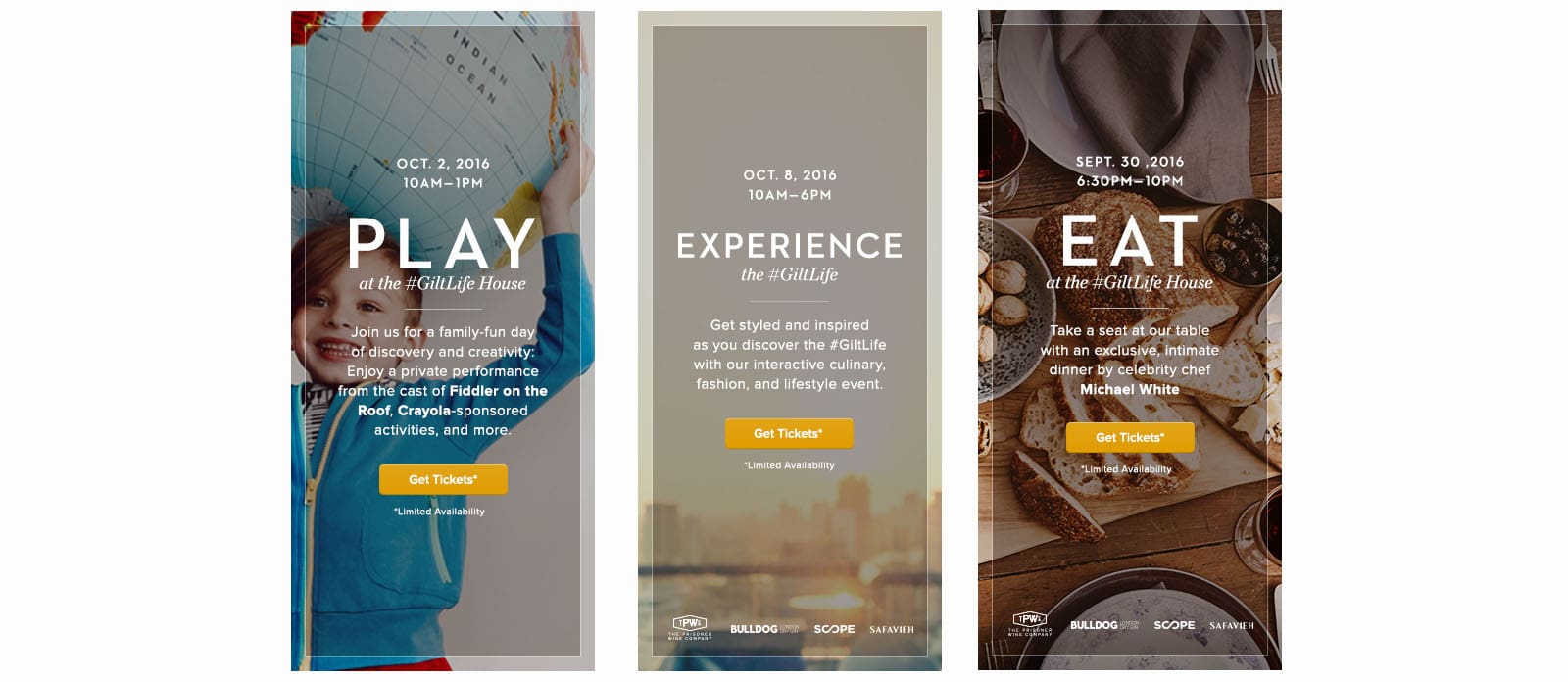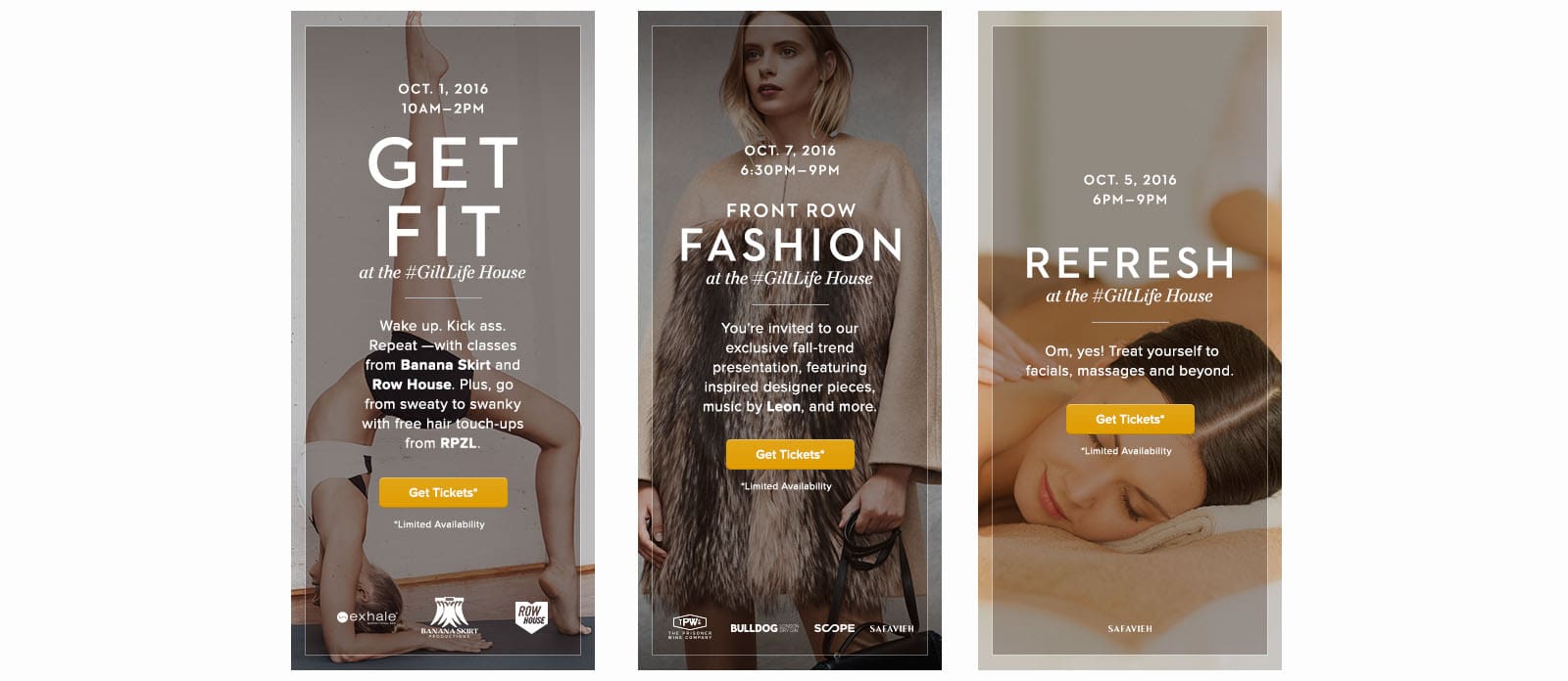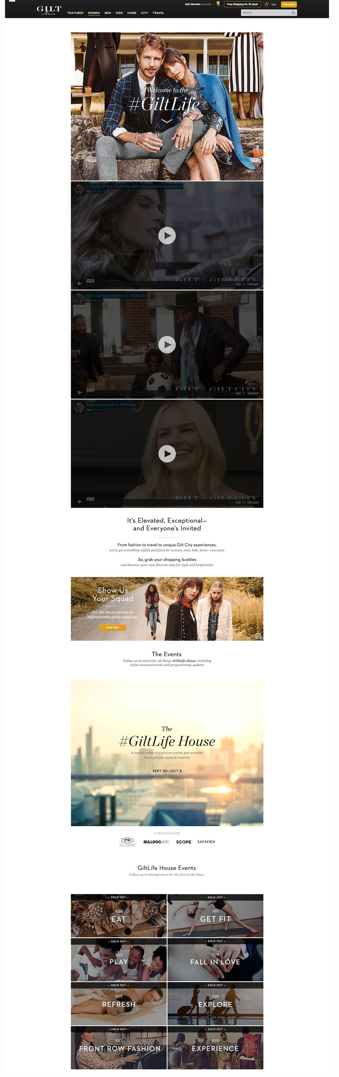 Working in partnership with our events agency partner LeadDog and video production partner Mustache, Gilt customized a downtown NYC townhouse end-to-end with Gilt merchandise and ran a program of almost daily lifestyle events for the press and public for nearly two weeks. Nearly every room in the house turned over each evening to prepare for a new event the next day, themed to the tenants of the GiltLife, including Fashion, Spa, Fitness, Beauty, Kids, Travel and Home Decor.