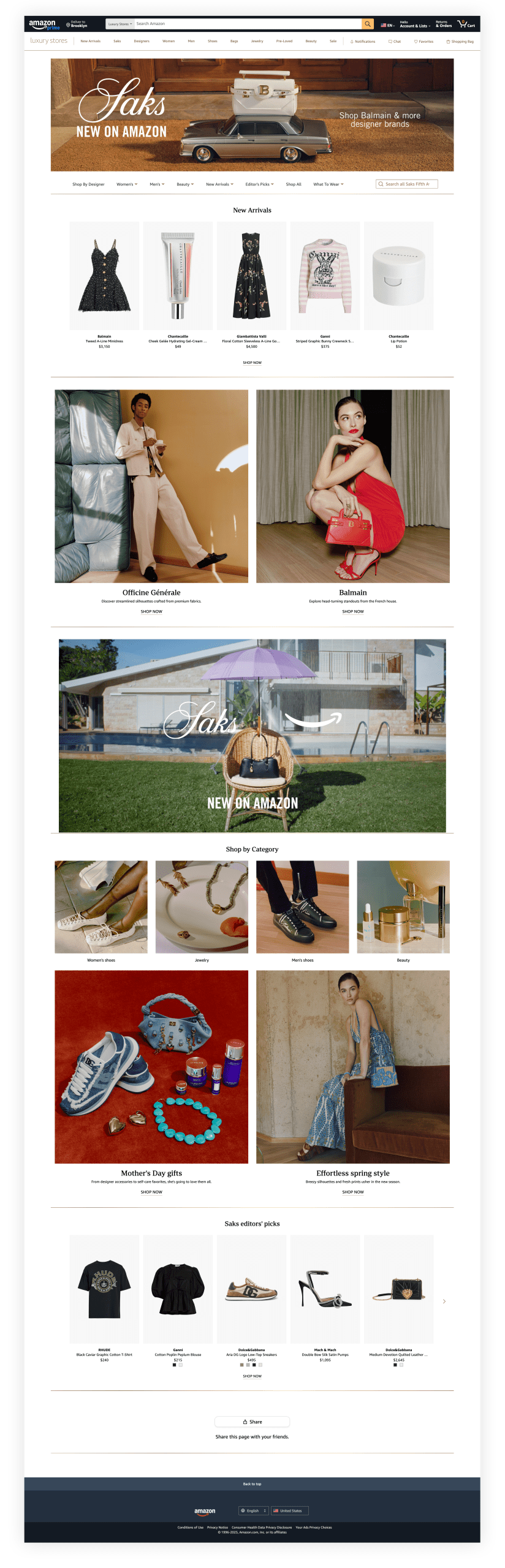 Saks Fifth Avenue collaborated with Amazon Fashion to launch ‘Saks on Amazon’ in Spring 2025. The new shopping experience enables customers to access a refined luxury assortment curated by Saks Fifth Avenue within Luxury Stores at Amazon. This collaboration brings together Saks’ luxury expertise with the convenience, ease and speed that customers have come to expect from Amazon, creating an inspiring shopping experience that enhances discovery and access to luxury fashion and beauty.